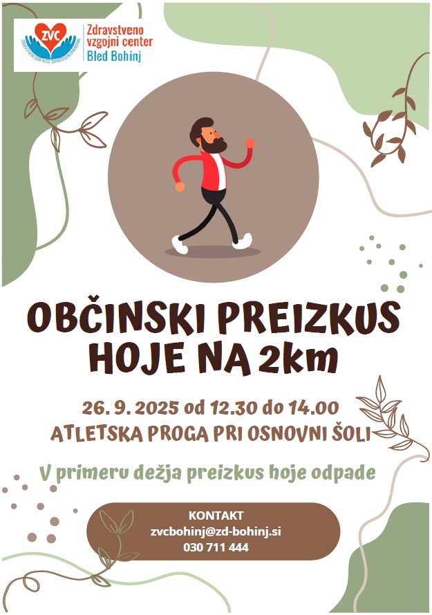 Zdravstveno vzgojni center Bled – Bohinj vas vabi, da se nam pridružite na preizkusu hoje na 2 km, ki bo v petek, 26. 9. 2025 od 12.30 do 14.00 ure na atletski progi pri Osnovni šoli Dr. Janeza Mencingerja v Bohinjski Bistrici.